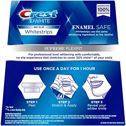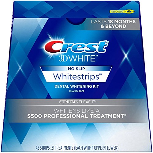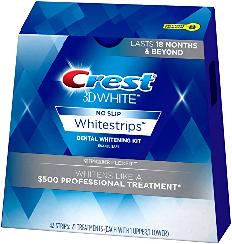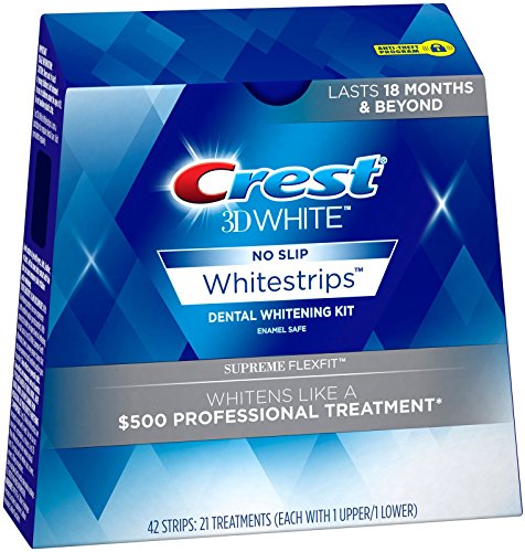 -. Binding : Health and Beauty -. Brand : Crest -. EAN : 0889714000465 -. Feature : Lasts 18 months and beyond / Use once a day for 1 hour. / Our whitest white for a multi-dimensional smile. / Exclusive Flex Fit technology design stretches and molds to custom fit your unique smile. / Advanced Seal Technology's no slip grip stays put so you can talk and drink water while whitening teeth. -. Label : Procter & Gamble - HABA Hub -. Manufacturer : Procter & Gamble - HABA Hub -. NumberOfItems : 1 -. PackageQuantity : 1 -. ProductGroup : Beauty -. ProductTypeName : BEAUTY -. PublicationDate : 2016-07-21 -. Publisher : Procter & Gamble - HABA Hub -. ReleaseDate : 2016-07-18 -. Studio : Procter & Gamble - HABA Hub -. Title : Crest 3D White Flexfit Dental Whitening Kit with 21 Treatments -. UPC : 889714000465