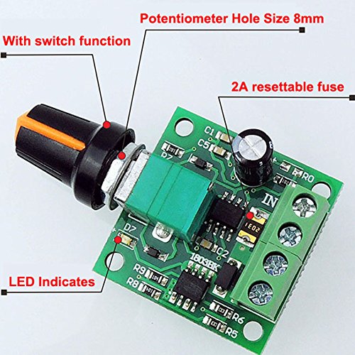 The motor speed controller is with a self-recovery fuse 2A and a Power-On LED light. It can easily provide a continuous current of 2A to your DC motor or other DC load.