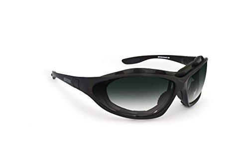 -. Feature : Frame: anticrash polycarbonate - mat black color - Wraparound design: protects the eyes from wind and bad weather, provide enhanced peripheral vision - Size: suitable for all types of faces (narrow to large) / Lens: dark gradient green - 100% UV protection / Removable windstopper and confortable rubber insert - Grip at the tip of the arm and nosepad: keeps the sunglasses from slipping / Interchangeables temples with elastic strap to have a very skin tight fitting for motorcycle and extreme sports / Gradient smoke lens allows to use it also during the evening , driving in tunnels or shaded street