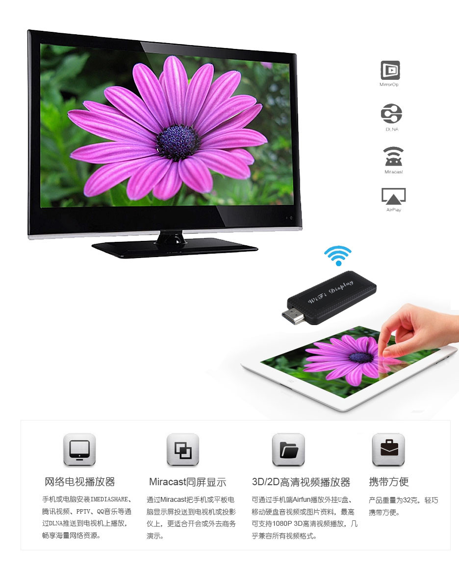 IOS Airplay Mirroring, Android Miracast, DLNA Push