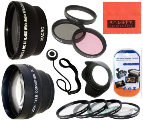 The camera's angle of view multiply the camcorder, digital/video camera by 0.43 times, which more than doubles the angle of view of the camera. Great for landscapes or recording in situations where a little creative curvature of field , it is wanted for a certain style. This excellent lens can be separated in two pieces (unscrewed): macro part and wide angle part. So you can use it both ways: like macro lens (without wide angle part) and like wide angle with macro together! This is a very unique feature of this lens for its price. So for the price of only ONE lens you are getting TWO! Professional 0.45x Super Wide Angle Lens *0.43X Professional Deluxe High Definition Super Wide Angle Lens *Built-in MACRO lens for extreme close-up shots *Digital SLR Pro Lens *Professional High Definition: PHD Lens reduces glass flare & ghosting caused by reflections *Special Element Frame: Special matte aluminum satin finish frame reduces reflections & optimized photography *Premium Rimmed Glass: High quality rimmed glass reduces light reflection around lens edge *Infrared Compatible: For high resolution day & night recordingFeature