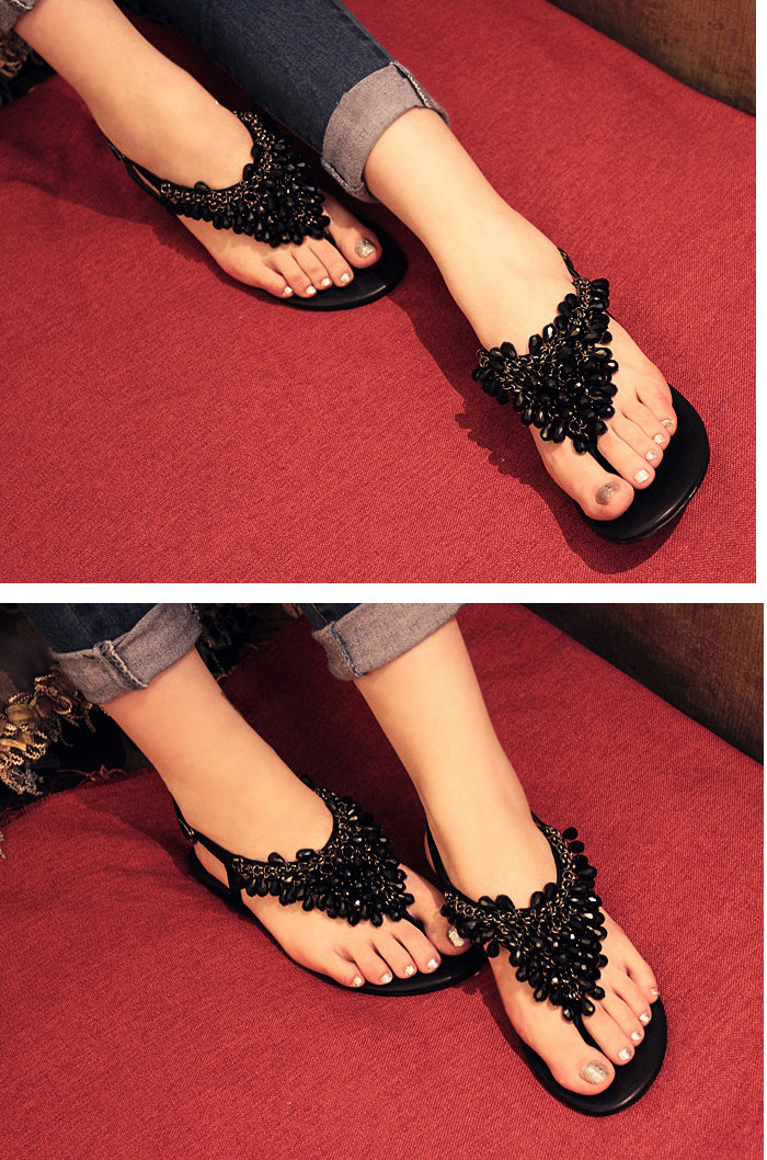 夏季 新款韩版波西米亚夹脚串珠水钻平底凉鞋 平跟夹趾鞋
