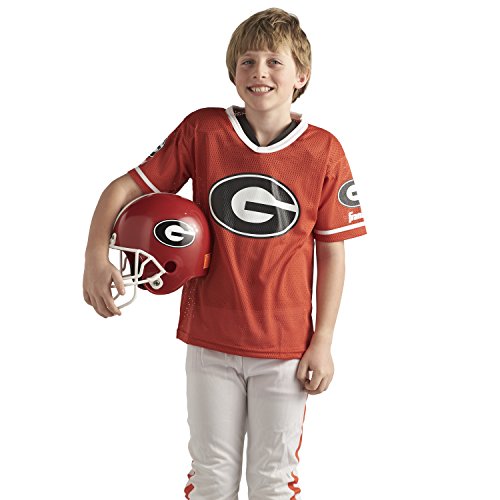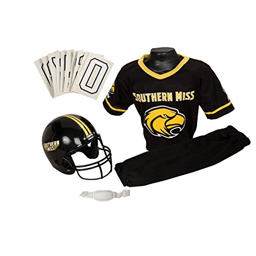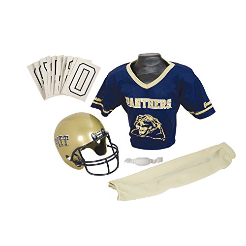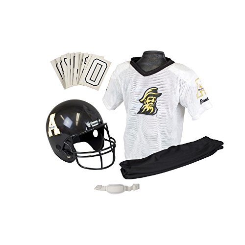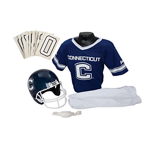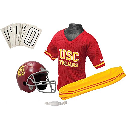 National Collegiate Athletic Association Deluxe Youth Team Uniform Set from Franklin Sports includes a team logo helmet with chin strap, 100% polyester team logo jersey with shoulder pads, team pants and a iron-on number kit (#'s 0-9). Fits most kid's ages 7-9 years old. Perfect as a costume or to show your team support on game day! Helmet must not be used as protective equipment in football or any other sport.Feature