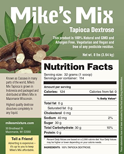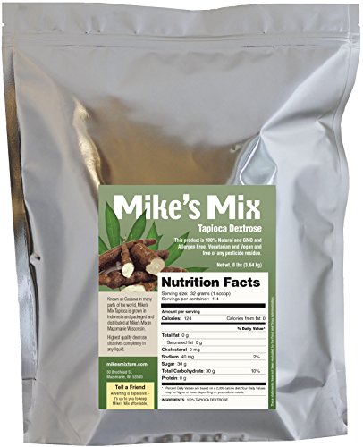 -. Binding : Health and Beauty -. Brand : Mike's Mix -. EAN : 0736032627648 -. Feature : Highest Quality, Sports Grade, Pure Tapioca Dextrose / 100% Natural, Non-GMO, Vegan and Vegetarian, Allergen Free / Free of Gluten any Pesticide Residue, Wheat, Corn or any other GMO grain / Mixes Instantly in any Liquid with a Slightly Sweet Taste. Great source of Carbohydrates and Energy -. IsAdultProduct : 0 -. Label : Mike's Mix -. LegalDisclaimer : These statements have not been evaluated by the Food and Drug Administration. This product is intended for human use by healthy, physically active individuals. If you are pregnant, lactating, under medical care or using any medications, please consult your physician before using this or any dietary supplements. -. Manufacturer : Mike's Mix -. PackageQuantity : 1 -. ProductGroup : Health and Beauty -. ProductTypeName : HEALTH_PERSONAL_CARE -. Publisher : Mike's Mix -. Studio : Mike's Mix -. Title : Mike's Mix Tapioca Dextrose Powder GMO-Free - 8 lbs -. UPC : 736032627648