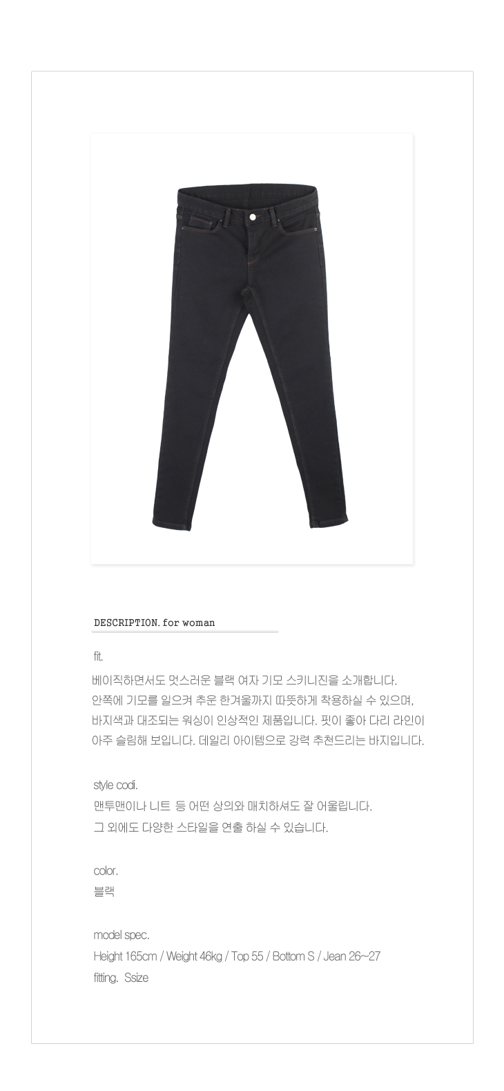 ▣상품설명 : 베이직하면서도 멋스러운 블랙 여자 기모 스키니진을 소개합니다. 안쪽에 기모를 일으켜 추운 한겨울까지 따뜻하게 착용하실 수 있으며, 바지색과 대조되는 워싱이 인상적인 제품입니다. 세미일자로 다리가 아주 슬림해 보입니다. 데일리 아이템으로 강력 추천드리는 바지입니다. style codi. 맨투맨이나 니트 등 어떤 상의와 매치하셔도 잘 어울립니다. 그 외에도 다양한 스타일을 연출하실 수 있습니다.