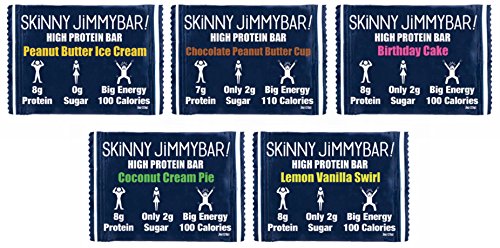 -. Feature : CLEAN HIGH PROTEIN BAR: 8g Protein, 2g Sugar, 100 Calories and gluten free. Note these are shipped in bulk packing. / 5 CLEAN SKINNY FLAVORS: Try - Chocolate Peanut Butter Cup, Birthday Cake, Coconut Cream Pie, Lemon Vanilla Swirl, or Peanut Butter Ice Cream. / CLEAN PROTEIN: JimmyBars! made with high quality whey protein and wholesome ingredients to create a better snack on the go! / CLEAN ENERGY PACKED: Great for a pre-workout bar, recovery bar, or protein breakfast bar JimmyBars! will keep you full for up to 6 hours. / ADVENTURE SNACK FOOD: JimmyBars! make great gluten free hiking cycling running workout recovery food and even make a perfect office snack. Enjoy them anywhere you are.