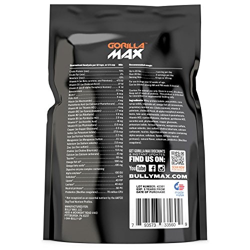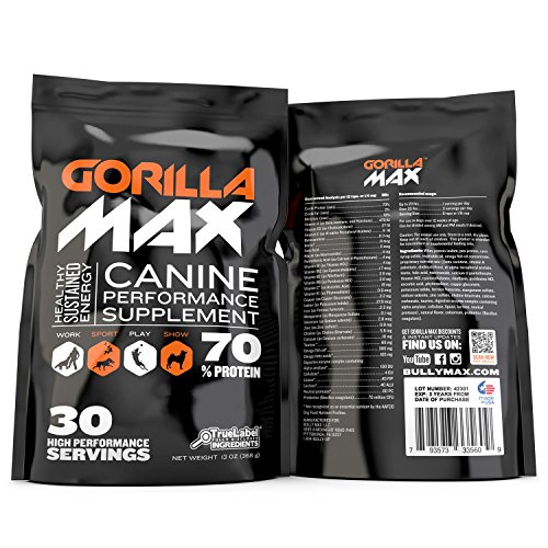 Gorilla Max is a muscle building and health supplement for all dogs over the age of 12 weeks. This product is veterinarian designed and approved and meets all FDA and AFFCO standards. This amazing product will help you get the best from your canine and also helps with digestion and protein consumption. Gorilla Max contains revolutionary nutrients and is one of the most talked about dog supplements on the market today Many working class dog breeds use this supplement from law enforcement canine's and shows dogs to champion breed winners. This supplement will add muscle and size to your dog as well as a whole host of health benefits. Bully Max are the makers of high quality dog vitamins, which focus on health and canine muscle building. The company holds high standards for all of their products. Gorilla Max is the top line supplement from Bully Max. There is 20 grams of protein in every single premium serving. This product can also be used by all dog breeds over the age of 12 weeks. Gorilla Max Most Asked Questions Can Gorilla Max and Bully Max Be Combined For Feeding? Yes, both products can be used with regular feeding of your dog's diet. Does Gorilla Max Make Dogs Aggressive or Change Them In Any Way? No, Gorilla Max does not change your dog's behavior. Can Only Pit Bulls Use Gorilla Max? No, Gorilla Max is for use in all dog breeds. Does Gorilla Max Use Any Steroids? No, it contains no steroids or anything harmful to dogs and is all natural. Does It Take Long To See Results? Positive results are seen within your dog in about 2 to 3 weeks' time. Also when the product is stopped the results will not be lost. You will keep seeing good results as long as you use the product. How Do I Give My Dog Gorilla Max? You mix it with your dog's current feeding. For dry food you can add a small fraction of water.Feature