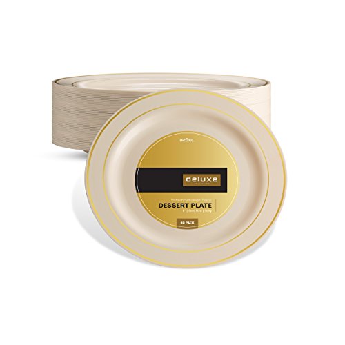 -DINE IN DELUXE!!! - High Gloss Shine...Fine China Look...Lustrous Gold Border....Rich Distinctive Look...all these characterize our DELUXE round plate collection created for sophistication and grace. Dress your table to perfection. Awe your guests with these gold rimmed dessert plates, yet quit the hassle of washing dishes. Go green, go disposable so you're not left with a huge cleanup once your guests have left. Or, rewash and store for your next special occasion. --BENEFITS AND FEATURES-- ★Classical round shape design with gold rimmed border to set your table to perfection ★Wow your guests and yourself alike ★Heavyweight premium quality plastic to ensure no sagging, tearing or breaking ★Perfect choice for weddings, receptions, banquets, reunions, holidays, or family get-togethers ★Great for outdoor entertaining too ★Just toss these disposable dishes and be on your way!!! ★Fun and Frugal?? Wash and reuse for your next event ★Pack of 40 DELUXE heavyweight round ivory 6 inch dessert plates with gold rim Isn't life better when we get together more often? Whether a backyard barbecue or an extended family reunion, we believe in the value of spending time with friends and family. Busy lives and long to-do lists often get in the way, but when we simplify events with beautiful disposables, we do get the time to get together. There's no better feeling. So what are you waiting for? Change The Look Of Your Table, WOW Your Guests With These White Gold Border Dinner Plates, And Set The Bar At An All-Time High. Type PRESTEE in the AMAZON SEARCH BOX to view our complete line of china-like dishes, plates, cutlery, party tumblers, and mini plates for your upscale celebration.TRUST US, You'll be GLAD you did!! #1Unique Round Place Setting CLICK ADD TO CART NOW!!! 0