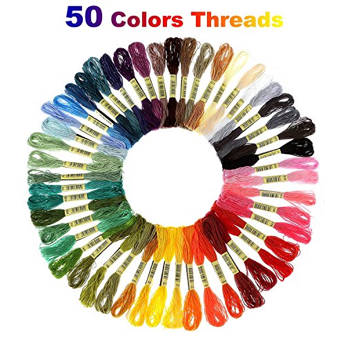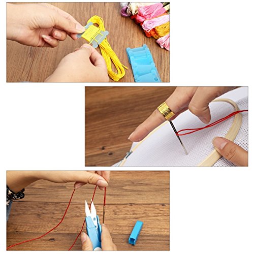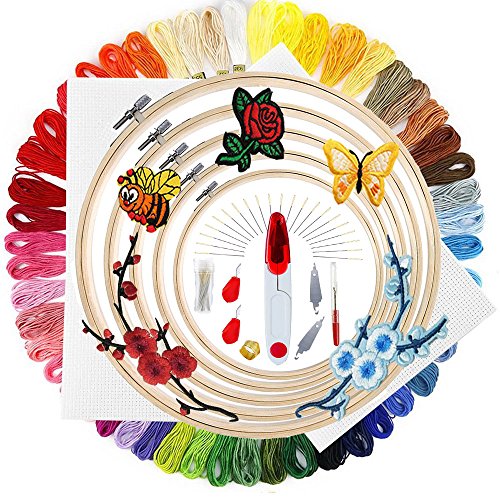 - ☀All Included: The magic embroidery set comes with 5pcs bamboo embroidery hoops, 50 color threads, 5pcs embroidery patterns, 4pcs 14 count white cotton classic reserve aidas, 30pcs 3 sizes embroidery needles, 4pcs cross stitch needle-threading tools, 1 pair of scissors, 1pcs thimble, 1pcs untwist tool.