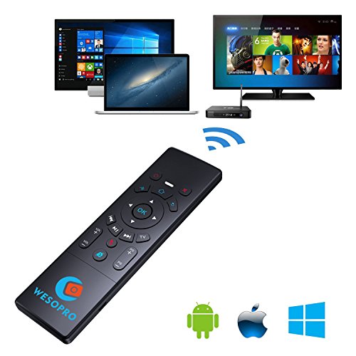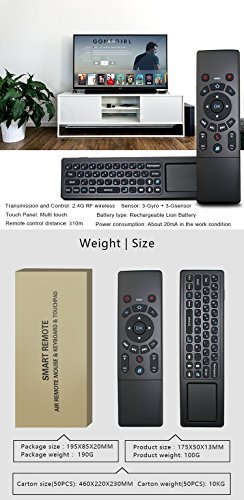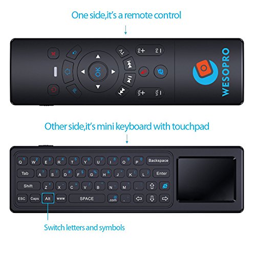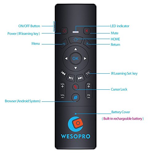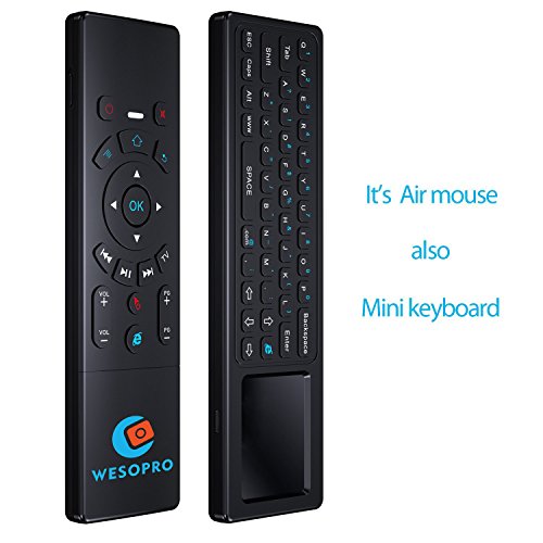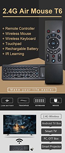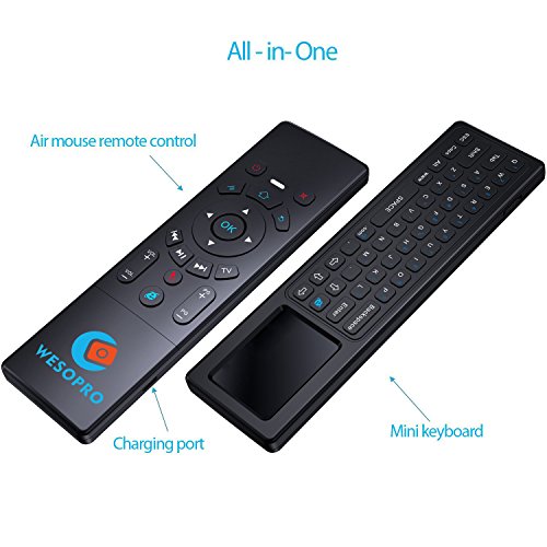 WESOPRO Upgraded Air remote mouse with Keyboard & Touchpad T6! It will provide you wireless multifunctional remote control, and accurate input on your PC / Android TV Box / Smart TV / HTPC! Mouse function - it converts your space movement in the air into an accurate displacement on the screen. Touchpad function - you can achieve functions like L/R mouse clicking and moving, as well as mouse scroll wheel. Keyboard function - it designed with QWERTY full keyboard that you can type fast. Remote function - it will provide you with the smooth navigation and perfect control for all you needs! Wireless transmission 2.4G wireless transmission distance up to 10 meters, it makes you enjoy unmatched comfort and absolute control of your smart devices without cable limitations! Plug and play Built-in 6-axis inertial sensor, 360 ° free space action recognition and sensing, it's very convenient to operate in horizontal and vertical mode for game. Portable and smart design You can use it at home, enjoying PC multi-media entertainment or take it to the office, suitable for conference, presentation & lecturing. Large compatibility Google/ Android OS, Linux OS, Windows all supported. Package Includes: 1 * T6 keyboard touchpad remote 1 * USB wireless receiver 1 * Recharge cable 1 * User ManualFeature