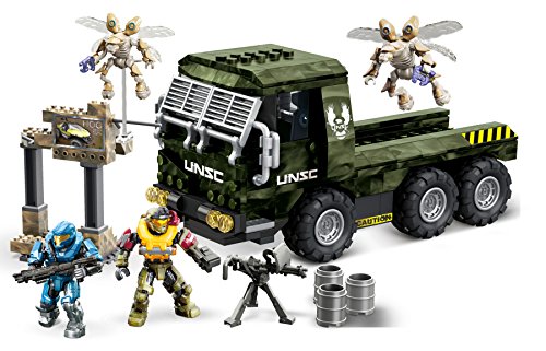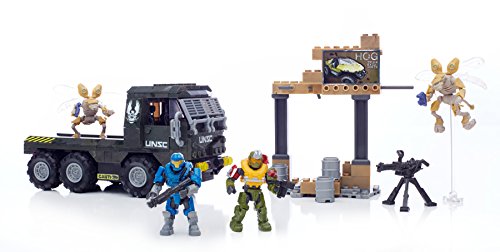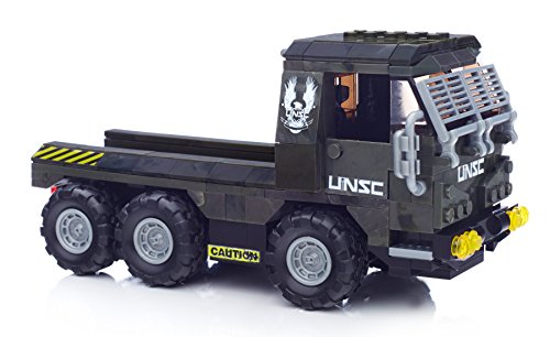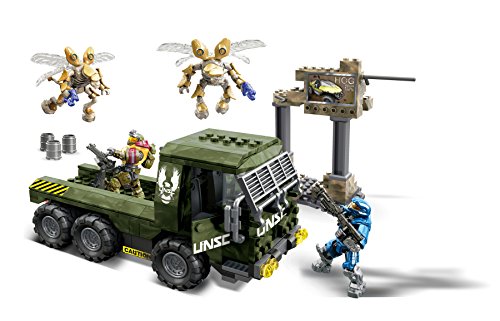 -. Feature : Fully buildable UNSC supply truck / Two super-poseable UNSC Spartan micro action figures, Spartan Jorge and a Spartan JFO, each with interchangeable armor system / Two Covenant Drones / Weaponry and accessories: Tactical Shotgun, two Plasma p.i.s.t.o.ls, M247H Heavy Machine Gun with tripod, Target Locator and Grenadier Backpack / Buildable environment of building ruins