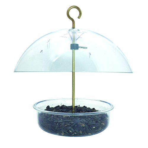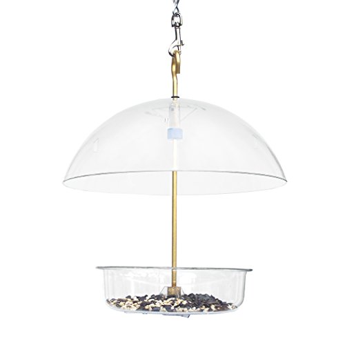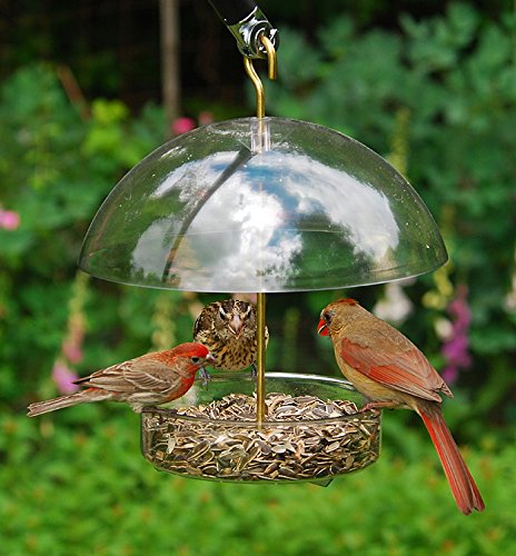 -. Feature : Attracts blackbirds, bluebirds, cardinals, doves, finches, flickers, jays, juncos, mockingbirds / Also orioles, redpolls, robins, siskins, sparrows, starlings, thrushes, woodpeckers, wrens, and others / Distance between dome and feeder tray is fully adjustable; 10-inches dome protects feeder tray from squirrels, undesirable birds, and the elements / Quick and easy cleaning and filling; includes hanging rods / Measures 11 by 10 by 4 inches