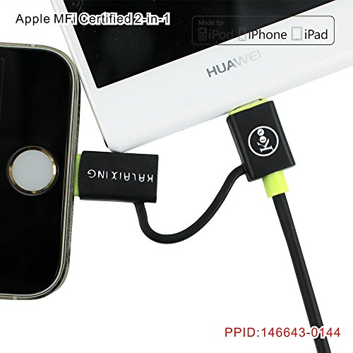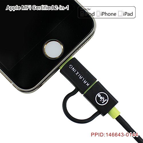 Apple MFi Certified: Skiva USBLink Duo Lightning cable contains an authorization chip issued by Apple which communicates with any Lightning connector device to ensure 100% Compatibility. Compatibility: Fast Charge and Rapid Sync for most Apple / Android / Windows smartphones/tablets including iPhone 6 6Plus 5s 5c, iPad Air2 mini3, iPod touch nano, Samsung Galaxy, LG, HTC and more. Length: 100cm Voltage: 5V/24V(Max) Flexible to be Coiled for Portable carrying but Tangle-free indeed. Sturdy & Durable for long-term using. Multiple compatibilities for various ranges of devices: hard drives, e-readers, handheld game consoles, camcorders, Samsung, HTC, Motorola, Nexus, Nokia, LG from laptop, HP, Sony, Blackberry, Android devices etc.. Mirco-B connector is set with the cable while 8 pin head is available for switched or connected upon Micro-B. Multiple-function to meet your need when you own apple device & other smart electronic devices at the same time.Feature