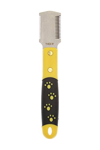 Product DescriptionHello Pet dual sided stripping knife featuring 16 coarse teeth, 21 coarse teeth, and a soft yellow rubber grip handle.0