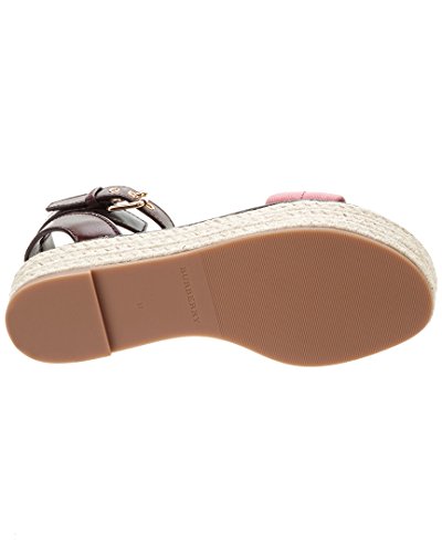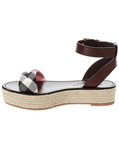 Studio : Burberry Publisher : Burberry Binding : Apparel Product Description Please note: Size selections are European. For US conversions, please reference size chart.. Color/material: pink house check trim, brown leather. Design details: gold-tone hardware. Adjustable ankle strap with buckle closure. Lightly padded leather insole. Rubber sole with traction. 1.5in heel. 1.5in platform. Please note: All measurements are approximate and were taken from a size 37; slight variations may occur. 0