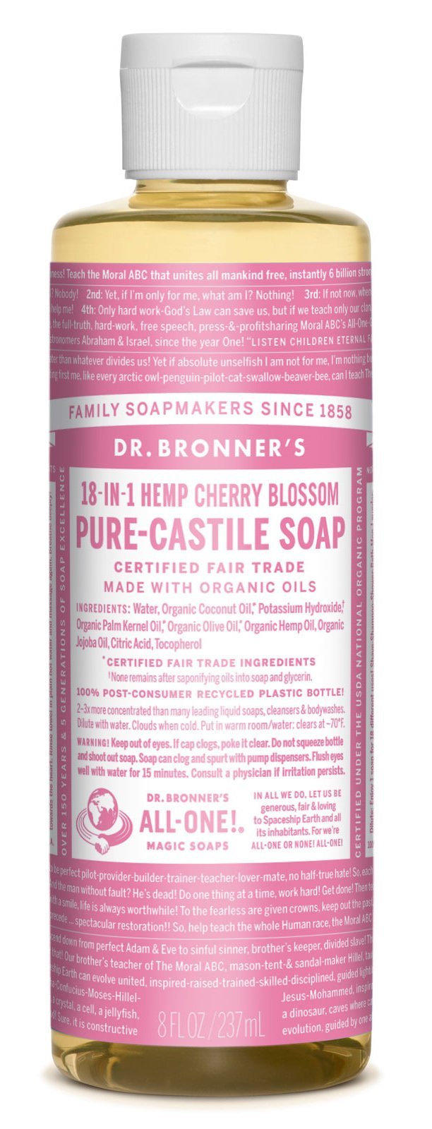 On the label of Magic Soap, Emmanuel Bronner's world peace and a thought for environmental protection are densely written.