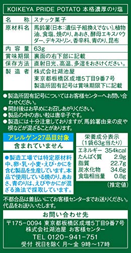 原材料:馬鈴薯(日本:遺伝子組換えでない)、植物油、食塩、焼のり、あおさ、酵母エキスパウダー、デキストリン、香辛料、青のり、昆布