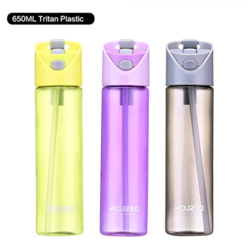 ★★ This straw bottle has purple, grey and yellow colors, fit for kids, girls, boys, women and men. The straw reaches all the way to the bottom, Flip, Bite and Sip. No tipping required (though possible: just remove the straw). The sprung latch that keeps your mouthpiece clean, press the button on the front, it springs open and the mouthpiece bottom is ergonomically shaped to easily push it back shut with a nice solid click. Plastic portable handle make it easy to carry for camping, hiking