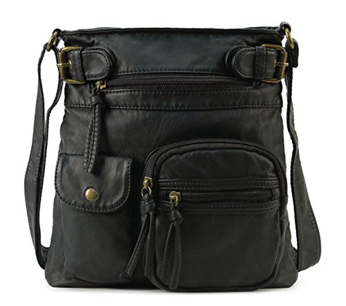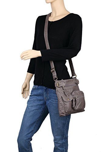 -. Feature : High quality washed synthetic leather with fabric lining. / Classic bronze hardware. Top zipper closure. / Interior cell phone pocket, multifunctional slip and side zipper pocket. / Adjustable shoulder strap drops 22.5". / Size: 9.4"x10.6"x2"