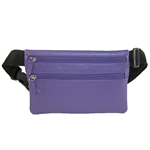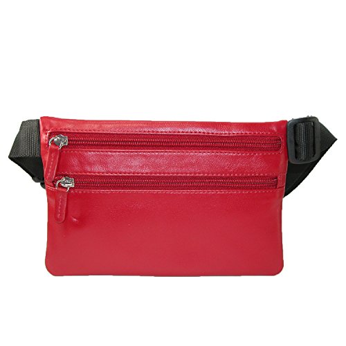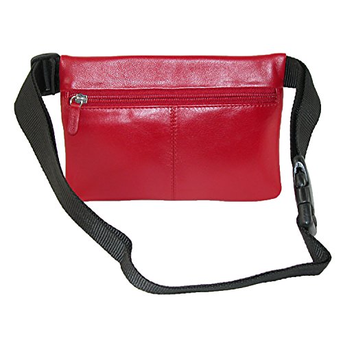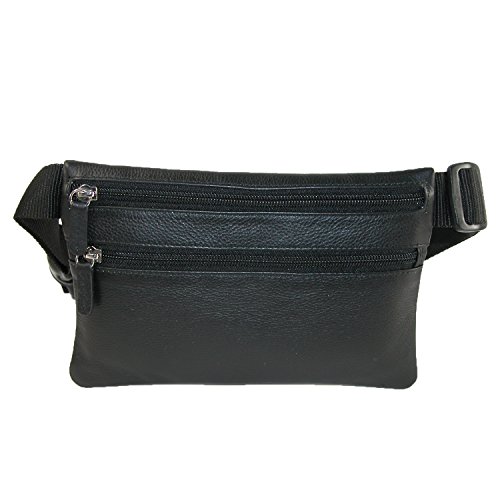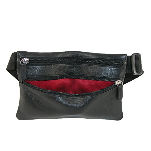 -. Feature : Measures 8 1/2 X 5 1/2 inches / Genuine leather pack with nylon strap / Pack has 2 front zippered pockets / 1 back zippered pocket for added security / Waist adjusts up to 48 inches