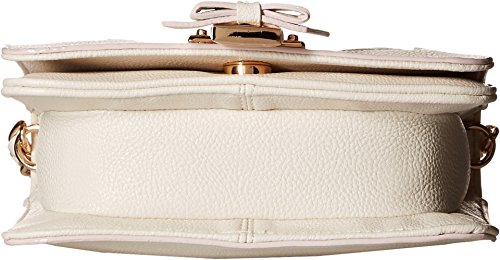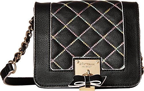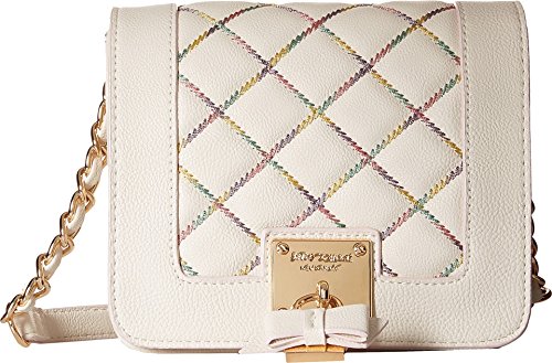 Magnetic snap closure. Flat cross-body strap with chain detail. Exterior features quilted design with bow detail and metal brand plate. Interior provides wallet/credit card slots. Imported.