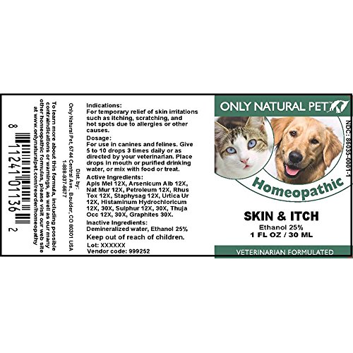 -. Binding : Misc. -. Brand : Only Natural Pet -. Feature : Safe, effective remedy to provide relief for skin irritations such and itching, scratching, and hot spots due to allergies or other causes / Helps relieve irritation and itchiness / Combination of homeopathic ingredients formulated by a holistic veterinarian / Available in a 1 oz liquid / Only Natural Pet brand products are 100% Guaranteed! -. Label : Only Natural Pet -. Manufacturer : Only Natural Pet -. MPN : 999252.1 -. NumberOfItems : 1 -. PackageQuantity : 1 -. PartNumber : 999252.1 -. ProductGroup : Pet Products -. ProductTypeName : PET_SUPPLIES -. Publisher : Only Natural Pet -. Studio : Only Natural Pet -. Title : Only Natural Pet Skin & Itch Homeopathic Remedy