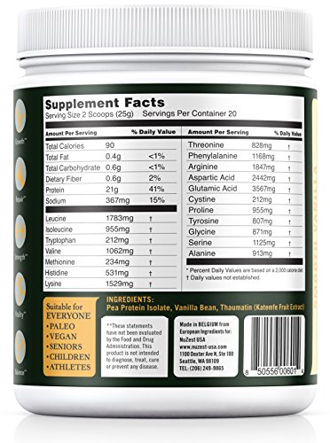 Made from European Golden Peas grown in France and then blended in Belgium, it is subject to the high european quality and authenticity standards. It's GMO free, gluten free, dairy free, lectin free and soy free. We use a natural, water based isolation process that uses no organic solvents or hexane and results in a smooth, mild taste.