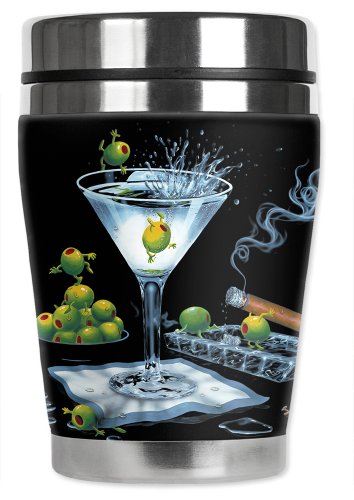 Mugzie Michael Godard Olive Party "Mini" Travel Mug with Insulated Wetsuit Cover, 12 oz, Black