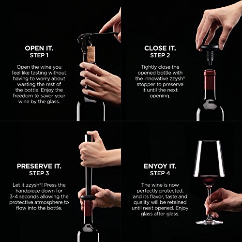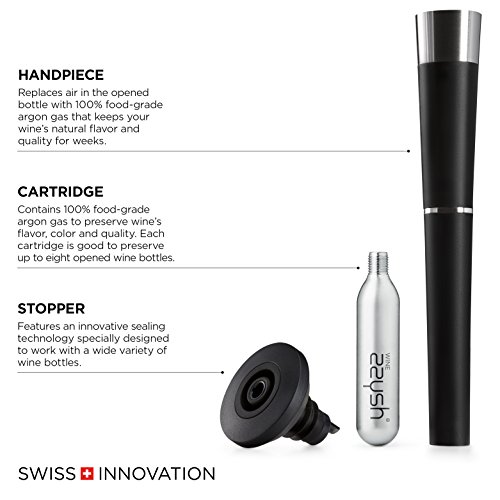 -. Binding : Kitchen -. Brand : zzysh -. Color : Black and silver -. Feature : A Swiss innovation - Keep your wine's natural flavor and quality for up for weeks. Enjoy a sip, a glass or more of your favorite wines without committing to the entire bottle. / Swiss Technology - The 100% food-grade argon gas exchanges the air in the bottle, keeps your wine from oxidation and preserves flavor and quality. Each cartridge is good for up to 8 wine bottles. / Premium and Functional Design - Smart, compact and portable Swiss design and high-quality materials make it so easy to use. Preserve your wine in just 3-5 seconds. / Innovative Sealing - The stopper features a revolutionary sealing technology designed to work with a wide variety of wine bottles. -. IsAutographed : 0 -. Label : zzysh -. Manufacturer : zzysh -. Model : zzysh Wine -. MPN : 7640151922016 -. PackageQuantity : 1 -. PartNumber : 7640151922016 -. ProductGroup : Kitchen -. ProductTypeName : KITCHEN -. Publisher : zzysh -. Studio : zzysh -. Title : zzysh Wine Preserver and Wine Stopper. Keeps wine fresh after it is opened.