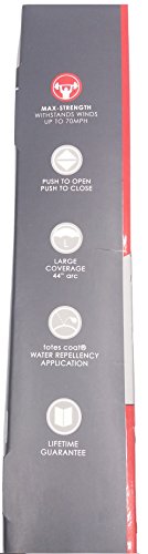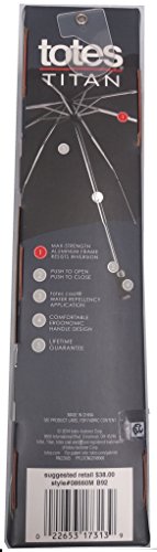 Studio : Totes Publisher : Totes Binding : Misc. Product Description Polyester NeverWet invisible coating allows rain to roll right off so umbrella stays 4x drier -- no dripping mess! Maximum strength frame withstands winds up to 70mph to prevent umbrella inversion Auto open and close -- one push of the button opens the umbrella, one push closes it Canopy Size: 43 inches; Folded Length: 11 inches Backed by totes' lifetime warranty - if yours breaks, simply return it to our warranty center 0