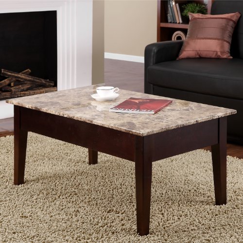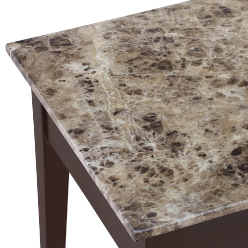 - Feature : Faux marble surface on the table top / Constructed of solid wood and wood veneers / Espresso finish / Storage compartment under table top / Assembly required