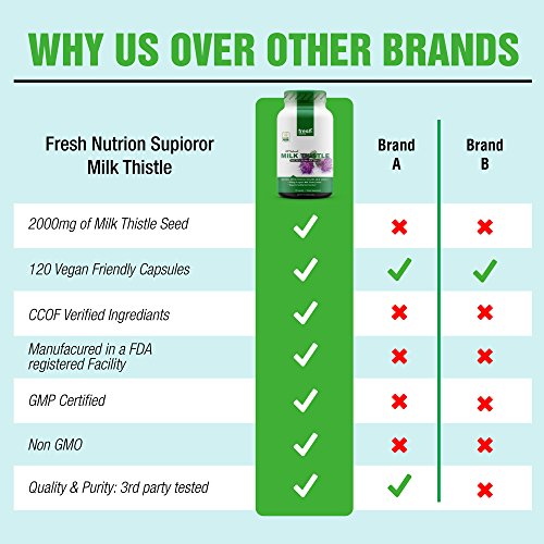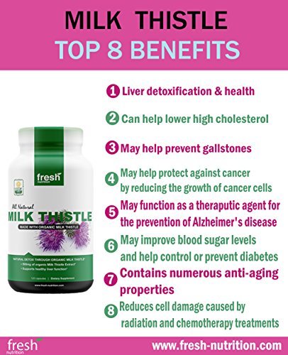 -. Feature : STRONGEST AVAILABLE: Our New Milk Thistle 4:1 is equivalent to 2000mg of Milk Thistle Seed, meaning it is probably the strongest available on Amazon. / 4 MONTH SUPPLY AT LAUNCH P.R.ICE: Each pot lasts 4 months when taking 1 capsule of 2000mg a day. You can get a whole year supply for just $44.97 if you buy 3 pots at our launch P.R.Ice of $14.99! / CURE YOUR HANGOVER FAST: Milk Thistle is known for its benefits of liver detoxification and helps speed up the recovery process for your liver, getting rid of your hangover faster! / BENEFITS: Milk Thistle powder in organic compliant capsules contains Silymarin, a group of naturally occurring full spectrum flavon lignan, which is well known for its liver support and detoxification. It is great for dogs and humans alike. / HIGH STANDARDS: Our Milk Thistle is CCOF Certified Organic, Vegan, Non-GMO, Gluten-Free, manufactured in a FDA registered facility and made in the USA, while every batch is third party tested for quality and purity.