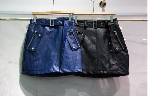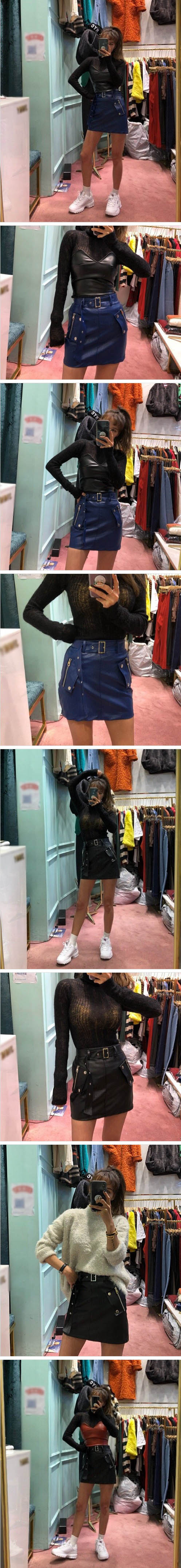 Women`s Belt Pointed Faux Leather Mini Skirt Black Blue
