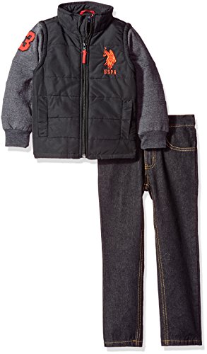 Puffer vest with fleece sleeves. 5 pocket denim jean finishes off this set.