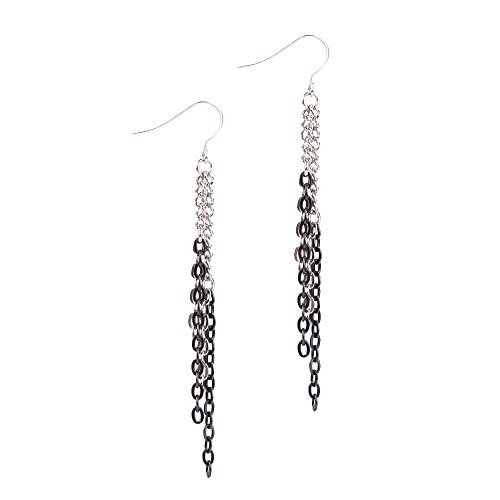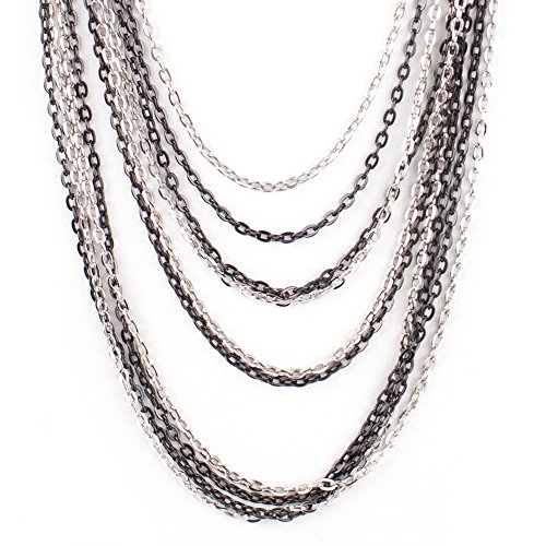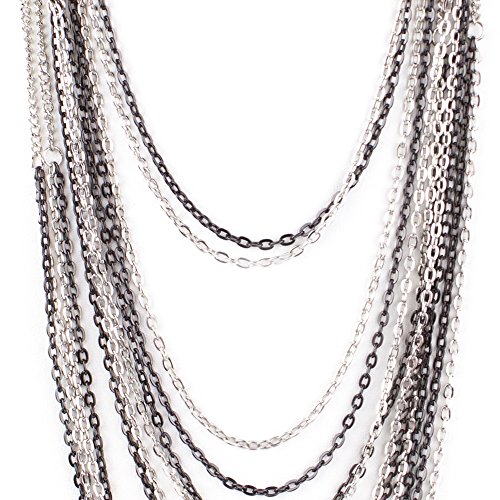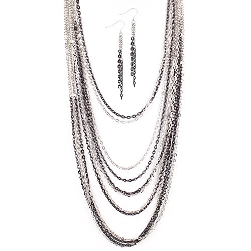 This inspired set gives your light sweater or summer ensemble a touch of sophisticated glam. The multi-chain bib necklace has the on-trend look of several layered necklaces all in one convenient piece. Sleek, delicately draping strands of black and silver-tone chain range from 26 to 29 inches in length. The necklace fastens with a lobster-claw clasp. The 3.5-inch earrings echo the look or can be worn on their own, and feature a French wire backing.