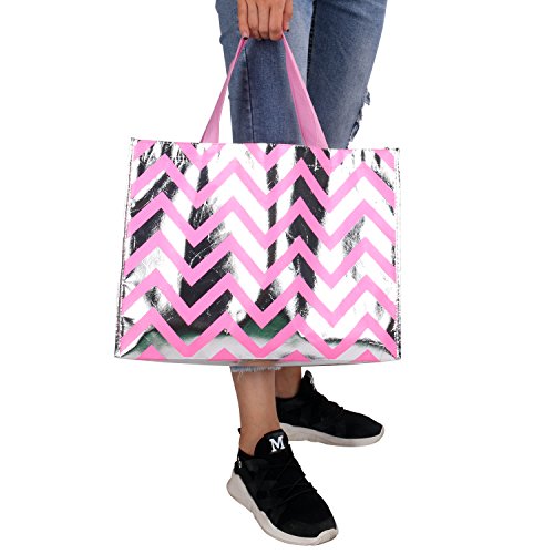 Kleanner Bling Bling Fashion Stripe Pink Non-woven Tote Bag, Eco Glossy Reusable Shopping Bag,Gift Bag,Goodies Bag,Stylish Party Bag,Silver With Stipe Pink,Set Of 10