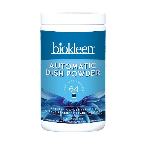 Product Description Biokleen® Automatic Dish Powder cleans tough, baked-on-food and grease, while natural oxygen bleach helps remove stains. Dishes come out spotless with no chemical taste or food particles. 0