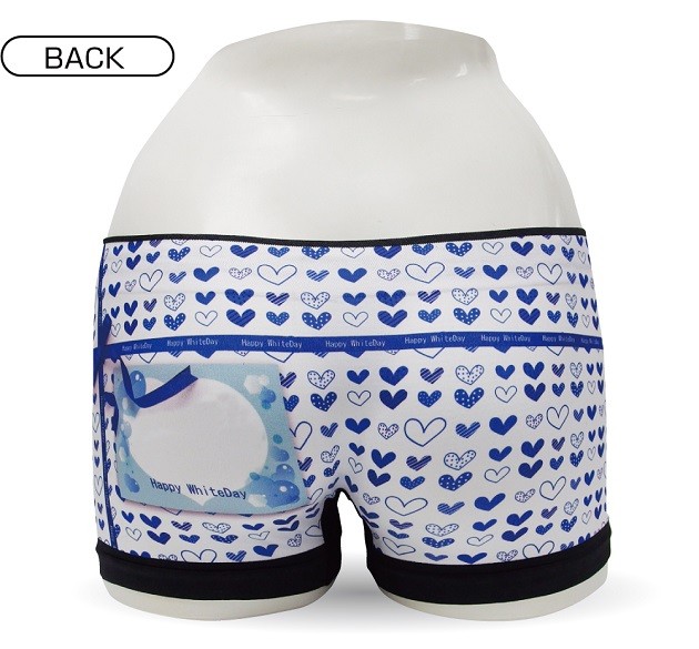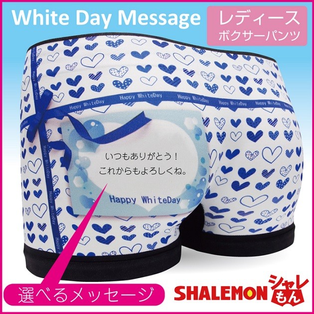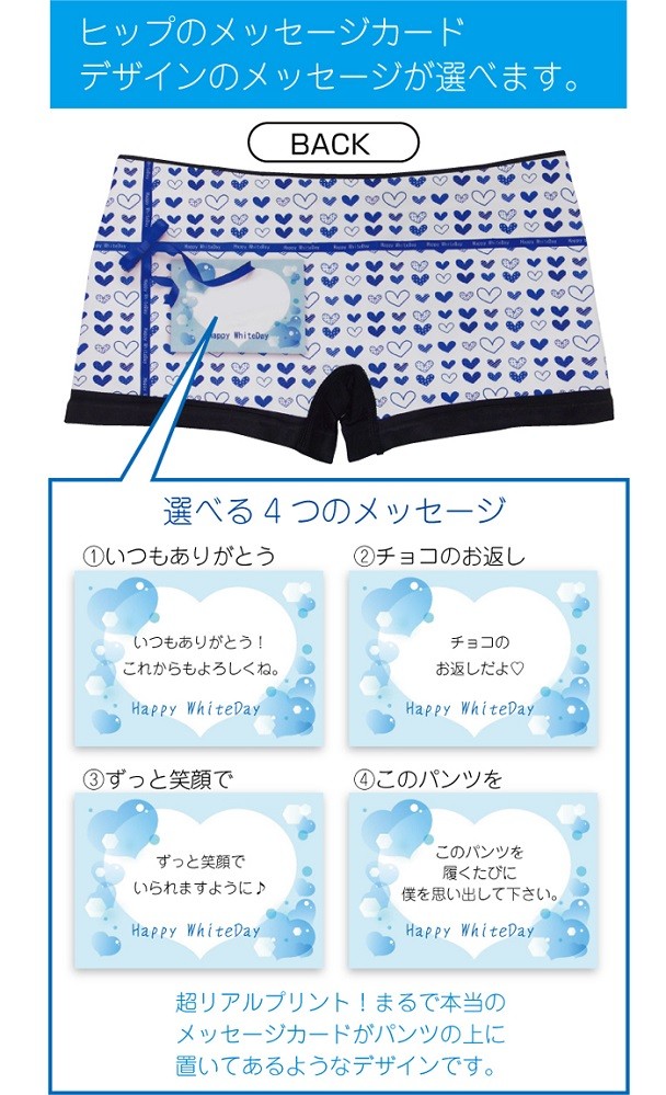 バレンタインちょこの お返しにホワイトデーデザインのボクサーパンツはプレゼントにピッタリ!バックプリント部分のプレゼントカードの中のメッセージが選べます。4つのメッセージ「いつもありがとう!これからもよろしくね。」 「チョコのお返しだよ」 「ずっと笑顔でいられますように♪」 「このパンツを履くたびに僕を思い出してください。」から選択できます。 ハートのモチーフが全面にデザインされた、とってもゴージャスな一枚です、リボンにはWHITDAYの文字がでざいんされています。 柔らかな履き心地が自慢の高伸縮素材のシームレスタイプは、フリーサイズなのでサイズの心配も少ないからオススメです。