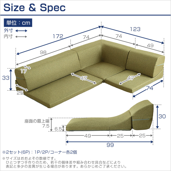 コーナー:(約)幅74x奥行き74x高さ33cm(座面高:7.5cm)