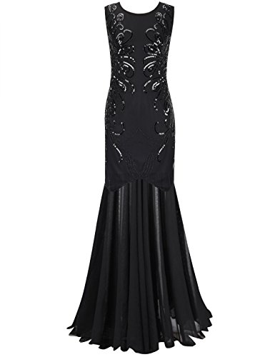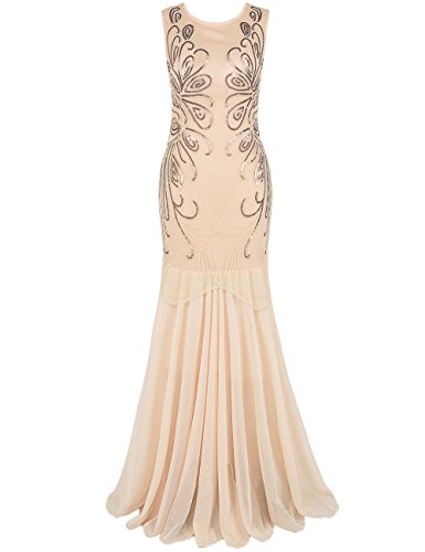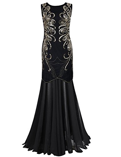 Dress like a goddess in the special occasion is every girl/ woman's dream,this long prom dress will make your dream come true.With elegant crew neck,deco with large quantity of sequins and beads,makes to paisley and other beautiful shape.The whole sequin pattern looks like peacock feather,like phoenix tail,and also like butterfly wings.The whole design gives you the perfect visual enjoyment.The dazzling pattern is standing out,will catch everyone's eyes.The back has the same splendid pattern as the front shows,a concealed zipper in the middle of the back,wrap up your perfect figure.The trumpet bottom part is light mesh fabric,you can dance or walk briskly.Enjoy your great wedding party/special occasion/roaring 20s with this sequin art deco gatsby maxi long ball gown.