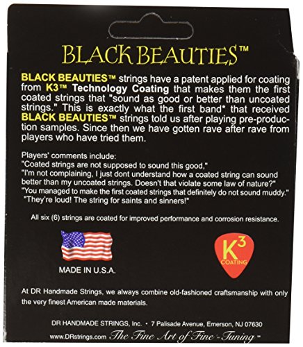 ReleaseDate : 2008-06-05 Studio : DR Music Publisher : DR Music Binding : Electronics Product Description DRs EXTRA-Life Black Beauties offer guitar players a superior black coated string without sacrificing the crisp tone, clarity, and volume of traditional DR HandMade Strings. EXTRA-Life is a super thin advanced .0003" coating on the plain electric guitar strings and on the wrap wire for added protection.DR's remarkable, and proprietary, patent pending K3T Technology Coating is the first coating that makes no apologies and no excuses. Players say these strings have less unwanted overtones, more volume, great clarity and articulation than standard uncoated strings. Yet, they provide the same protection against corrosion due to humidity and perspiration as well as the increased tonal life coated strings have come to be known for.Extra Heavy Gauge: 12-15-24-32-42-52. 0