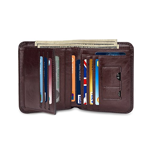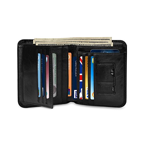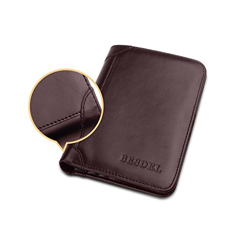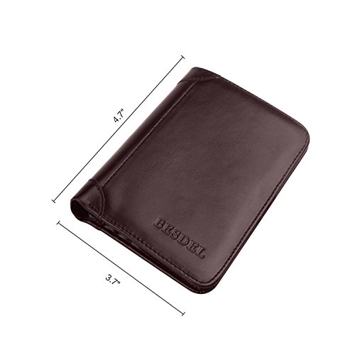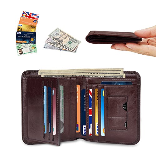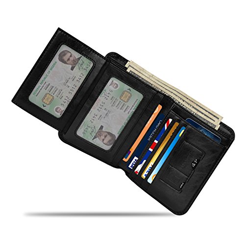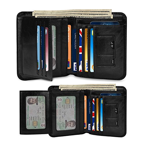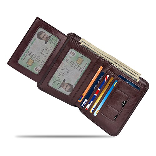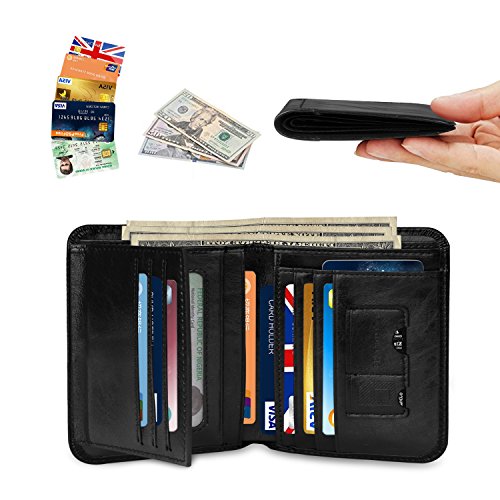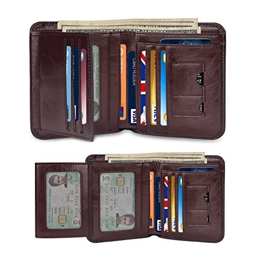 Outer Material: Vegetable Tanned Cowhide Leather Inner Material: Fabric Compact Size: 4.7" x 3.7" x 0.6"(L x W x H)(folded, empty) -- 11card slots inside ( that hold 10-18 credit cards) -- 2 currency pockets for all your cash -- 2 ID windows (for Driver License Work/School ID/Passport Card) -- 1 SD card pocket