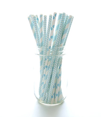 Blue Baby Shower Straws (50 Pack) - Baby Boy Paper Party Straws - Stripe, Polka Dot & Chevron Zig Zag Cake Pop Sticks, Frozen Winter Wedding Straw...