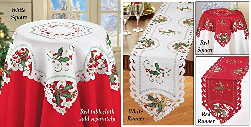 -. Feature : Linens feature exquisite embroidery, lacy openwork & delightful details / The holly design is accented with golden stars and intricate details / Made from polyester / Sizes available either as a Runner (68" x 13"), or a Square (34"Sq.) / Shop with confidence! For over 50 years, Collections Etc has been bringing unique, whimsical, inspirational, and home solution products to customers. All Collections Etc products come with a 60 day, easy return policy and 100% satisfaction guarantee