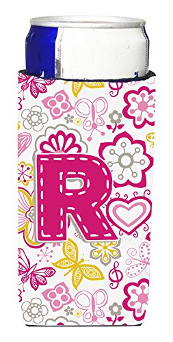 Letter R Flowers and Butterflies Pink Ultra Beverage Insulators for slim cans CJ2005-RMUK