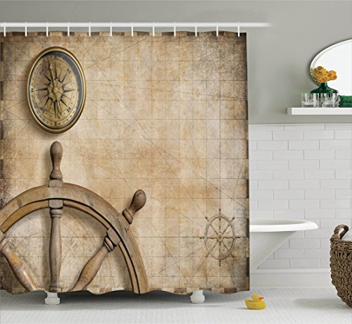 Nautical Decor Shower Curtain Set by Ambesonne, Steering Wheel and Compass with Vintage Map Setting Captain's Chamber Finding Treasure Print, Bathroom Accessories, 84 Inches Extralong, Beige