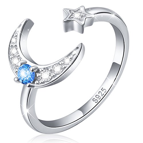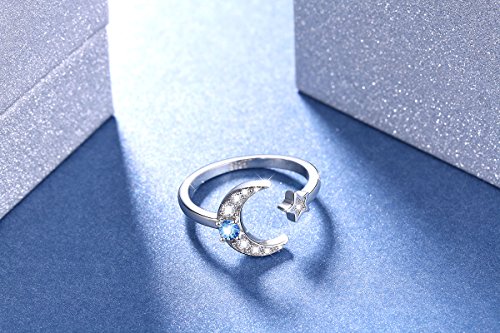 -. Feature : Theme: Moon and Star Ring for Girls / Ring Size: Adjustable Size; Total Weight: 2.36 g / Material: 925 Hypoallergenic Sterling Silver, Tarnish Resistant, Nickel Free / Package: 1 x Silver Cleaning Cloth and 1 x Velvet Bag / Birthday Gift, Graduation Gift, Christmas Gift, Halloween Gift,Thanksgiving Day Gift, Valentine's Day Gift, Mother's Day Gift, Wedding Anniversary Gift, Black Friday
