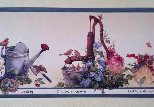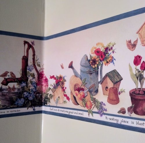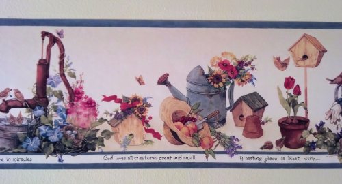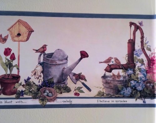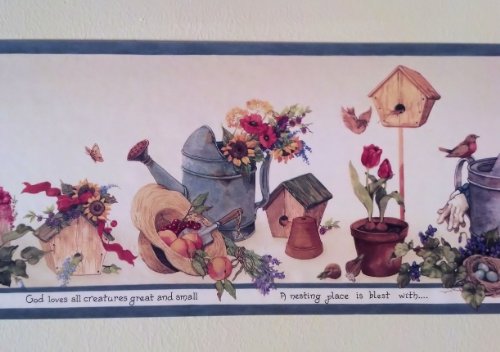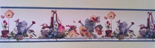 -. Feature : Wallpaper Border - 15 Foot Prepasted Spools / Pattern HRB3999 - Blue Edge / Birdhouses, Gardening, Plants Flowers / Gardening Wallpaper Border / Country Wallpaper Border - 7 Inches Wide
