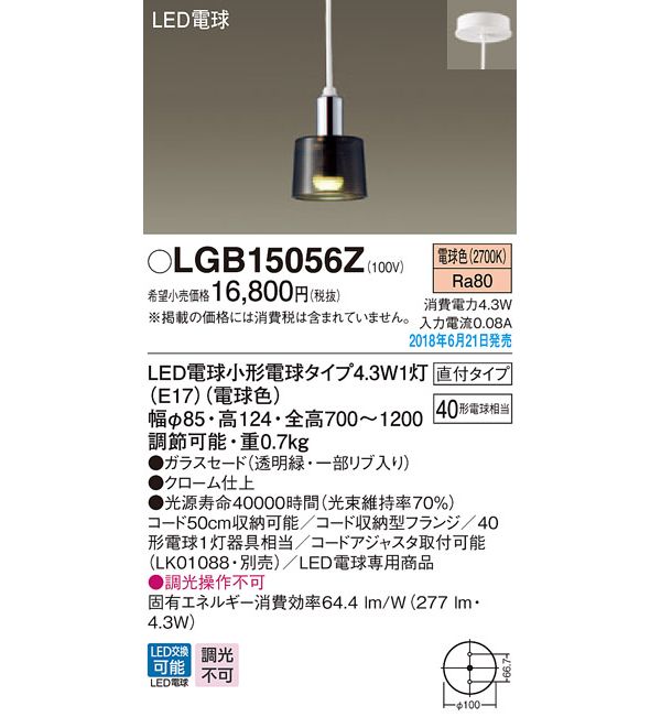 ●光源:LED電球小形電球タイプ4.3W1灯(E17)(電球色)、色温度:2700K、光源寿命40000時間(光束維持率70%)