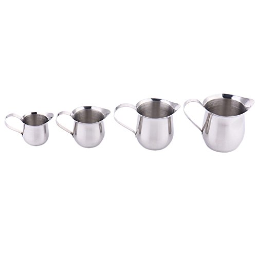 Feature: 100% brand new and high quality Perfect for preparing coffee such as latte, cappuccino Widely used in Coffee shop, western restaurant, bar etc. A must have for any coffee enthusiast Seamless design with pour spout Mirror surface treatment, smooth and glossy Specification: Material:18/10 Stainless Steel Size: Style A: about 7.8 * 4.3 * 4.5 cm / 3.07 * 1.69 * 1.77 in Style B: about 8.5 * 5.5 * 5.6 cm / 3.35 * 2.16 * 2.20 in Style C: about 10.5 * 6.3 * 7 cm / 4.13 * 2.48 * 2.75 in Style D: about 11 * 7.2 * 8 cm / 4.33 * 2.83 * 3.15 in Color:Silver Package include: 1 x Frothing Jug 0